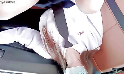 Young girl in college uniform masturbates in car