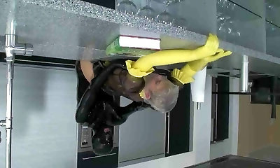Ultra-kinky dude in a latex suit fucks his plump maid sub